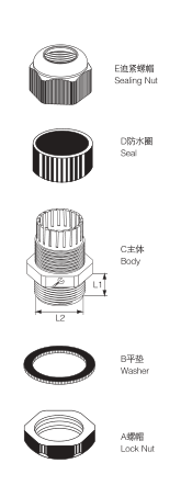 ■Material: Las partes A, C, E están hechas de nailon PA66 aprobado por UL. Las partes B y D están hechas de caucho de butadieno estireno (INBR).