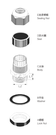 ■Material: Las piezas ACE están hechas de nailon PA66 aprobado por GF U. Las piezas B y D están hechas de caucho de nitrilo butadieno (NBR).