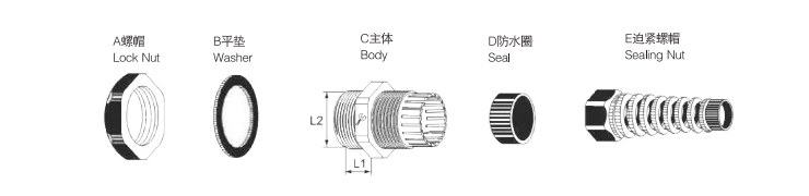 ■Material: Las piezas A, C y E están hechas de nailon PA66 aprobado por UL, las piezas B y D están hechas de caucho de nitrilo butadieno (NBR).