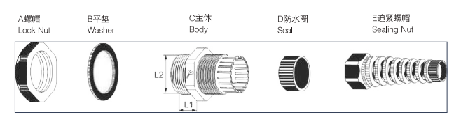 ■Material: Las piezas A, C, E están hechas de nailon PA66 aprobado por UL, las piezas B y D están hechas de caucho de nitrilo butadieno (NBR).