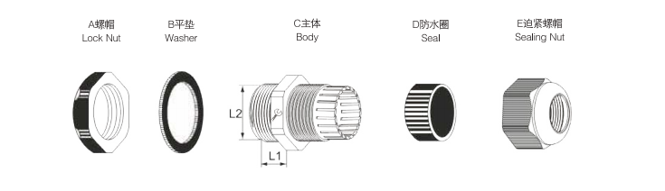 ■Material: Las piezas A, C y E están hechas de nailon PA66 aprobado por UL, las piezas B y D están hechas de caucho de nitrilo butadieno (NBR).