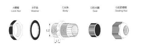 ■Material: Las piezas A, C, E están hechas de nailon PA66 aprobado por UL, las piezas B y D están hechas de caucho de nitrilo butadieno (NBR).