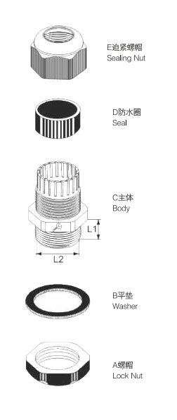 ■Material: Las piezas A, C, E están hechas de nailon PA66 aprobado por UL, las piezas B y D están hechas de caucho de nitrilo butadieno (NBR).