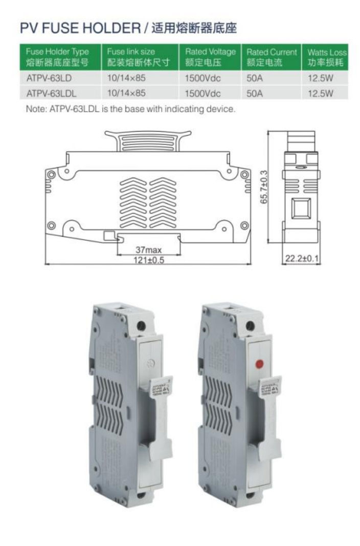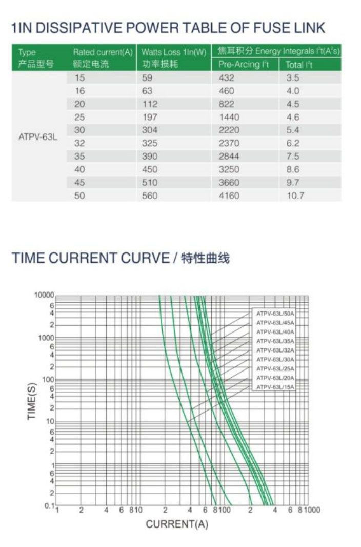 Esta serie de fusibles es adecuada para líneas con tensión nominal de CC de hasta 1500 V y corriente nominal de hasta 125 A. Se conectan en serie y en paralelo con paneles fotovoltaicos y baterías para proporcionar protección contra cortocircuitos al sistema de carga y convertidor. Asimismo, para plantas fotovoltaicas, el inversor Confluence ofrece protección contra cortocircuitos; y para sistemas de generación de energía fotovoltaica, ofrece protección de ruptura rápida contra sobretensiones y sobrecorrientes por cortocircuito, con una capacidad de corte nominal de hasta 50 kA. El producto cumple con los requisitos de las normas de la Comisión Electrotécnica Internacional (CEI) 1EC60269-6 y UL248-19.