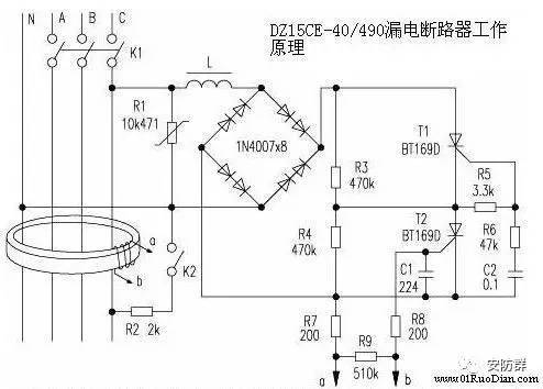 En la figura, L es una bobina electromagnética que acciona la desconexión del interruptor de cuchilla K1 en caso de fuga. Además, se utilizan dos 1N4007 en serie en cada brazo del puente para aumentar la tensión no disruptiva. Las resistencias de R3 y R4 son muy elevadas, por lo que, al cerrar K1, la corriente que circula por L es muy pequeña, insuficiente para la desconexión de K1. R3 y R4 son las resistencias de ecualización de tensión de los SCR T1 y T2, lo que reduce los requisitos de resistencia de tensión de estos. K2 es un botón de prueba que simula una fuga. Al pulsar el botón de prueba K2, se conecta K2, lo que equivale a una fuga de tierra del cable de tensión externo. De esta forma, la suma vectorial de la corriente que atraviesa la línea trifásica y la línea neutra del anillo magnético no es cero. Se produce una tensión inducida en ambos extremos de b, que activa inmediatamente la conexión de T2. Dado que C2 tiene una tensión predefinida, tras activarse T2, C2 se descarga a través de R6, R5 y T2, generando una tensión en R5 que activa T1. Tras activarse T1 y T2, la corriente que fluye a través de L aumenta, lo que activa el electroimán y desactiva el interruptor de accionamiento K1. La función del botón de prueba es comprobar si el dispositivo funciona correctamente en todo momento. El principio de la acción del electroimán ante una fuga en el equipo eléctrico es el mismo. R1 es un varistor que protege contra sobretensiones.