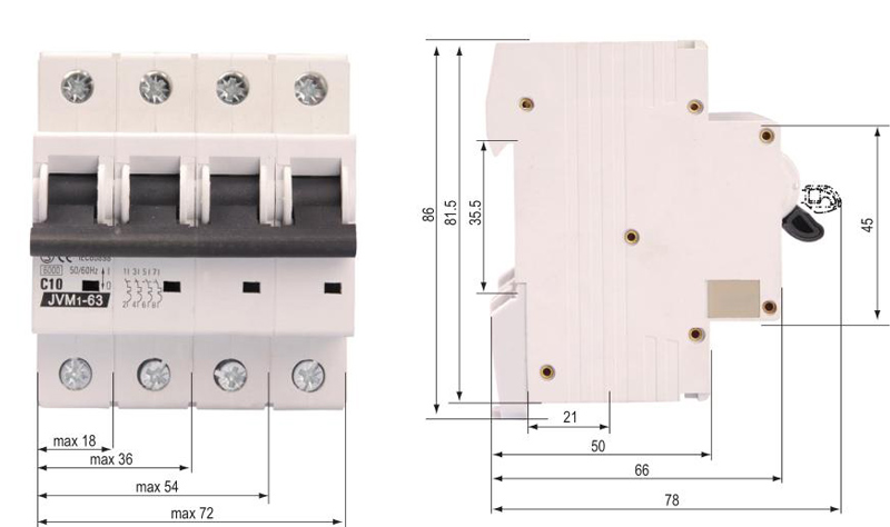Dimensiones generales e instalación del disyuntor MCB JVM1-63 de 4 polos y 63 amperios