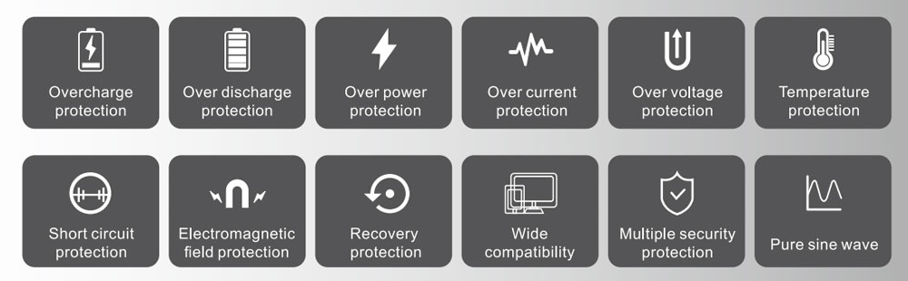 | Interruptores | Para salida DC12V, USB, inversor de CA y luz LED, todas las funciones son con un interruptor. | ||