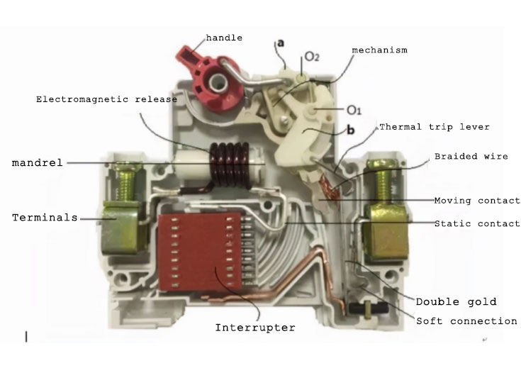 Cuando la carga sufre un cortocircuito grave y la corriente del circuito es muy elevada, la bobina de disparo electromagnético genera un intenso campo magnético que atrae la armadura a través del núcleo de hierro. La armadura impulsa la palanca hacia arriba. Los dos ganchos se disparan gracias a la acción del resorte de reacción. Los contactos dinámico y estático se desconectan, cortando así el circuito.